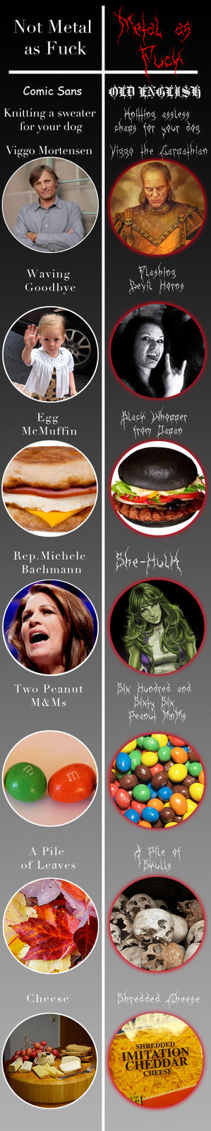 On November 26th, 2012, LA Weekly published a blog post titled “How to Determine if Something Is Metal as Fuck”, in which the post’s author provided a chart that distinguishes between perceived metal and non-metal themes in a satirical tone.[2]
