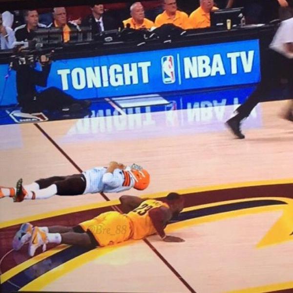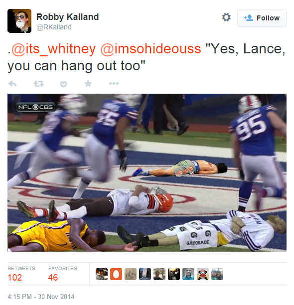 On November 30th, 2014, the Cleveland Browns quarterback laid motionless on the field after losing the ball due to a failed snap during the team’s regular season match against the Buffalo Bills (shown below, left). That day, Twitter user Robby Kalland[1] posted a photoshopped image of Manziel laying on the ground with several other professional athletes (shown below, right).