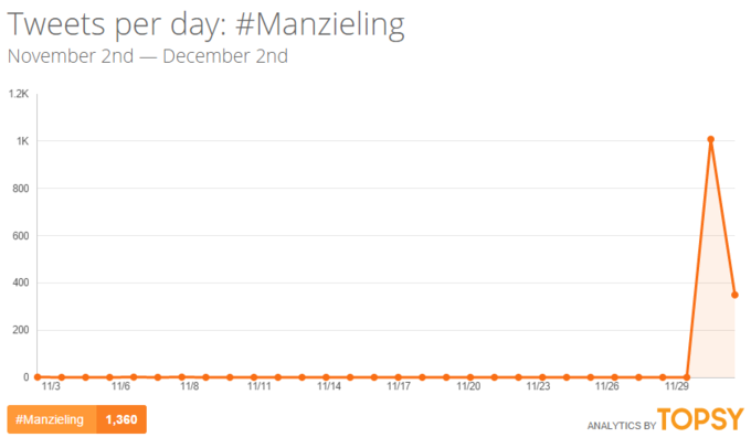 The same day, the local news site Cleveland.com[2] published an article about the photoshop meme, highlighting several notable examples from Twitter. According to the Twitter analytics site Topsy,[3] the hastag #Manzieling was tweeted over 1,300 times in the first 24 hours.