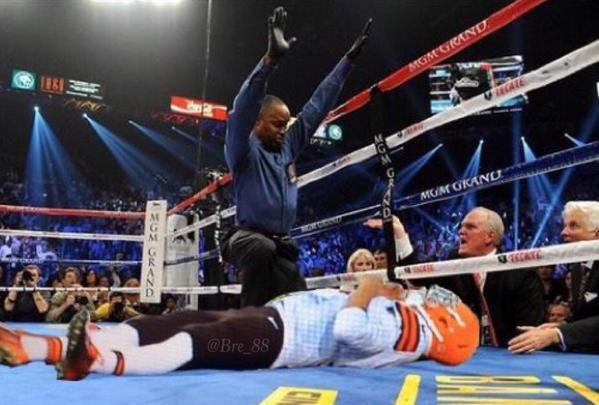 That evening, the novelty Twitter account @CockyWesWelker[6] tweeted several photos of people mimicking Manziel’s pose with the hashtag “#Manzieling”[5] (shown below, left). Many Twitter users subsequently posted photoshopped images of Manziel laying on the ground in other base pictures with the “#Manzieling” hashtag. On December 1st, Redditor violentrob11 posted an edited photo of former professional boxer Muhammad Ali standing over Manziel in a boxing ring to the /r/buffalobills[4] subreddit (shown below, right).