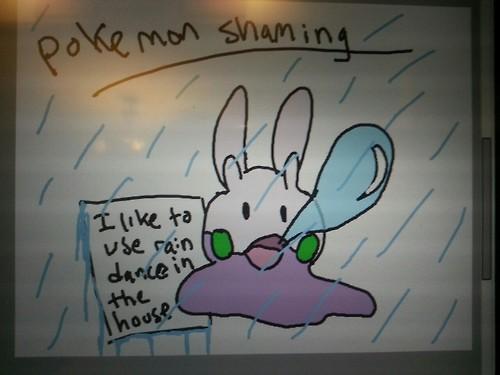 Pokemon Shaming, also shortened as Pokeshaming, is a series of illustrations featuring Pokemon characters holding up signs with confessions of their own humorous transgressions that are characteristic of their abilities, drawn in the style of dogshaming photographs