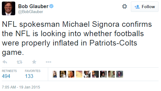 On January 19th, sports columnist Bob Glauber tweeted[3] that NFL spokesman Michael Signora confirmed that the Patriots were being investigated (shown below).