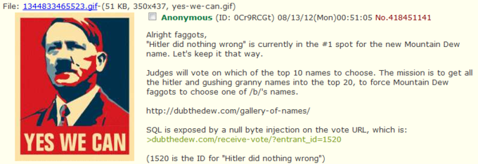 On August 13th, 2012, an anonymous 4chan user submitted a post calling for others to participate in the Dub the Dew contest and vote the name “Hitler did nothing wrong” among several others to the top of the contest page.