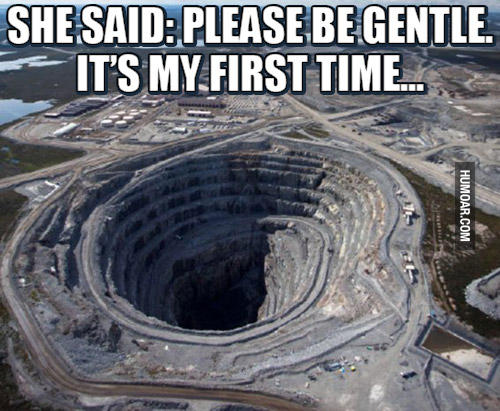 “It’s My First Time” is an image macro meme that revolves around images of large gaping holes with the phrase captioned on them. The meme is sarcastically referring to women who lie about being virgins.
